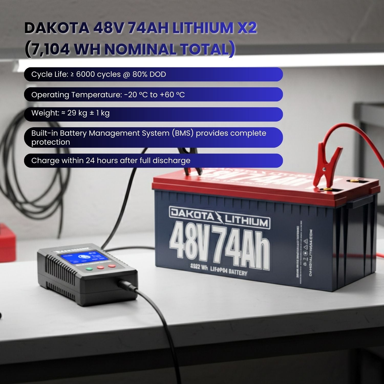 Batteries: 2 × 48V 74Ah (each = 48V × 74Ah = 3552 Wh); combined nominal = 7104 Wh).