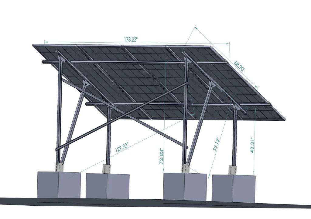 You can install 4 solar panels (1x4 portrait) on top-of-ground mount system producing a peak power of approximately 1300 to 1800 watts depends on the Nominal output power of your solar panels. In addition, you can use Bi Facial Solar panels that utilize the reflection of the sun from the environment increasing the production by approximately 1000 watts to reach a maximum capacity of up to 3000 watts.